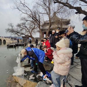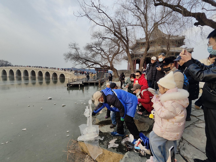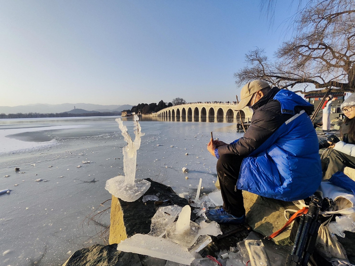 “嚯,这儿有人做冰雕!夕阳照上去,可真美啊!”在颐和园十七孔桥南侧岸边,常能看到一位老人拿着工具刀,“咯吱咯吱”地凿着冰,或将其刮成飞鸟状,或将其刻成火炬状,不一会儿就能凿出一尊栩栩如生的冰雕。若恰逢傍晚,夕阳洒在冰雕上,更显晶莹美丽,吸引不少游客拍照打卡。
