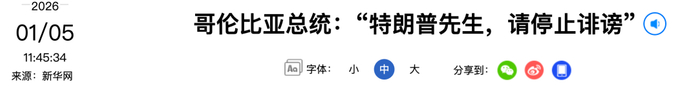 哥伦比亚总统佩特罗4日在社交媒体上发文,要求美国总统特朗普停止对他的诽谤,并强调拉丁美洲人民拥护共和、独立,拒绝拉美地区被美国单方面划为“势力范围”。