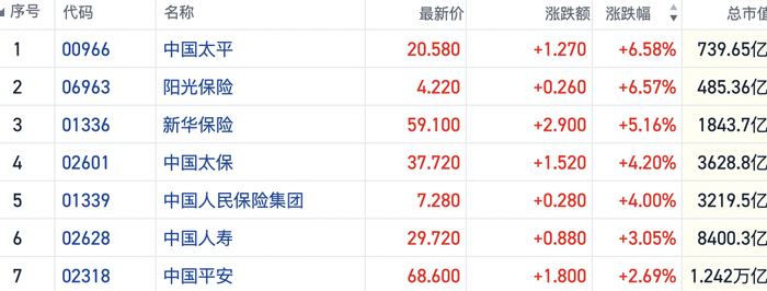 截至发稿,阳光保险(06963.HK)、中国太平(00966.HK)均涨超6%,新华保险(01336.HK)及中国太保(02601.HK)涨逾4%,双双续创历史新高。