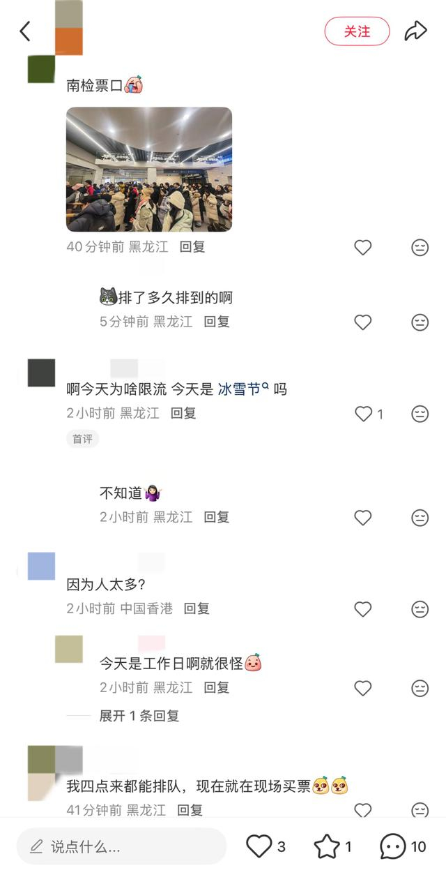 澎湃新闻(www.thepaper.cn)注意到,在社交平台上,有网友发布的照片显示,当日下午,哈尔滨冰雪大世界已经限流,南检票口排满了游客。