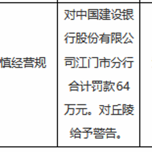 1月5日金融一线消息,国家金融监督管理总局江门监管分局行政处罚信息公示列表显示,中国建设银行股份有限公司江门市分行及相关责任人员贷款业务严重违反审慎经营规则,中国建设银行股份有限公司江门市分行被罚款64万元,丘陵被给予警告。