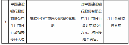 建设银行江门市分行被罚64万元:贷款业务严重违反审慎经营规则