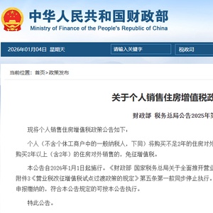同时,就在节前,财政部国家税务总局联合发文,个人销售购买2年或以上的住房,免征增值税。