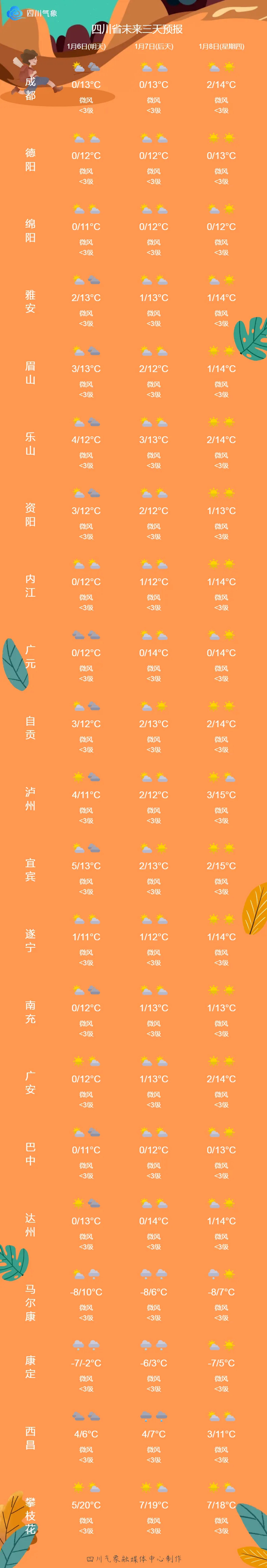今天有多冷?气象实况观测显示,1月5日8时,第一方阵以泸州6.2℃领头,攀枝花、宜宾、自贡、乐山紧随其后,气温站上了5℃;其余16个城市气温全都不足5℃。除川西高原上的康定、马尔康以外,成都、巴中、广元气温也低至0℃以下,依次为-0.2℃、-0.8℃、-2.6℃。