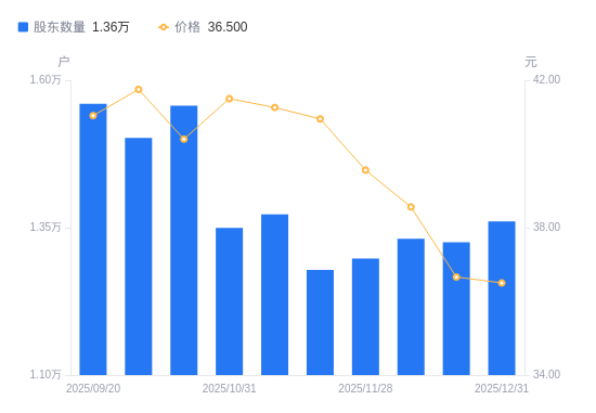 近一年(2024年12月31日至2025年12月31日),盛景微A股股东户数从1.39万户,减低至1.36万户,降幅2.39%,区间股价下跌5.73%。