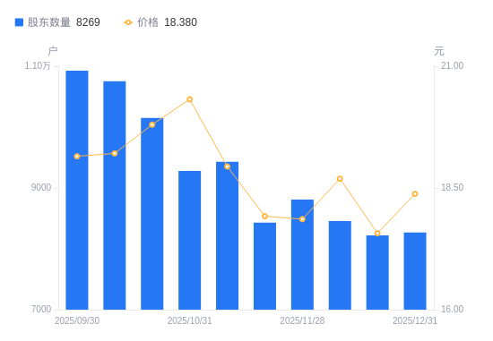 1月4日消息,数据显示,截至2025年12月31日,腾亚精工A股股东总户数为8269户,较上期(2025年12月19日)增加48户,增幅0.58%。公司最新A股总股本为1.42亿股,其中流通A股1.15亿股,户均持有流通A股数量为1.39万股,较上期减少81.13股,降幅0.58%;户均持流通A股市值25.54万元,较上期增加9830.21元,增幅4.00%。