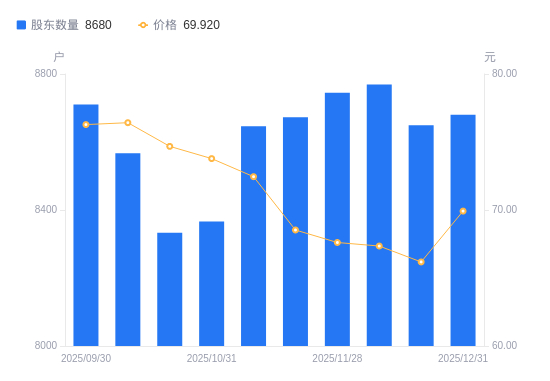 近一年(2024年12月31日至2025年12月31日),港迪技术A股股东户数从1.25万户,减低至8680户,降幅30.78%,区间股价下跌18.61%。