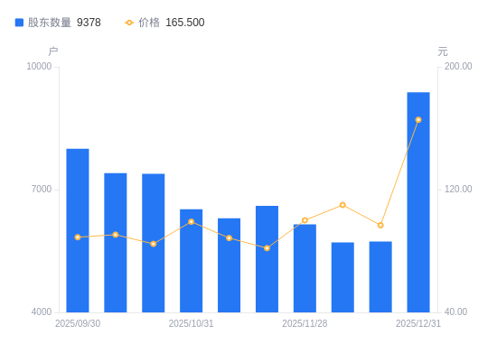 近一年(2024年12月31日至2025年12月31日),恒勃股份A股股东户数从8358户,增加至9378户,增幅12.20%,区间股价上涨518.04%。