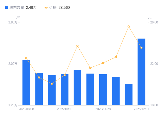 1月5日消息,数据显示,截至2025年12月31日,腾达科技A股股东总户数为2.49万户,较上期(2025年12月19日)增加8757户,增幅54.24%。公司最新A股总股本为2亿股,其中流通A股6729.9万股,户均持有流通A股数量为2702.66股,较上期减少1466.01股,降幅35.17%;户均持流通A股市值6.37万元,较上期减少4.31万元,降幅40.38%。