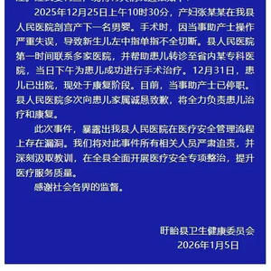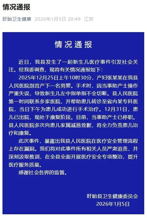 1月5日晚,盱眙县卫生健康委员会发布情况通报称,12月31日,患儿已出院,现处于康复阶段。目前,当事助产士已停职。县人民医院多次向患儿家属诚恳致歉,将全力负责患儿治疗和康复。此次事件,暴露出我县人民医院在医疗安全管理流程上存在漏洞。我们将对此事件所有相关人员严肃追责,并深刻汲取教训,在全县全面开展医疗安全专项整治,提升医疗服务质量。