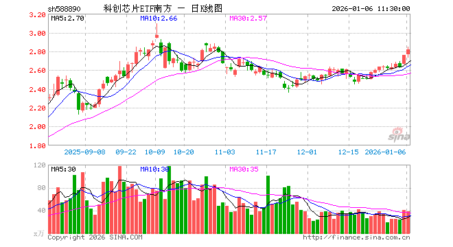 1月6日,截止午间收盘,科创芯片ETF南方(588890)涨2.14%,报2.816元,成交额1.08亿元。科创芯片ETF南方(588890)重仓股方面,海光信息截止午盘涨0.02%,澜起科技涨5.59%,中芯国际涨1.96%,寒武纪涨0.00%,中微公司涨7.35%,芯原股份涨3.61%,华虹公司涨2.90%,沪硅产业涨3.31%,华海清科涨5.03%,晶晨股份涨1.71%。