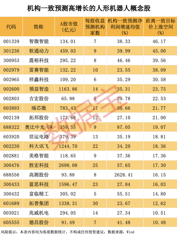 当前A股市场布局人形机器人产业链的概念股数量众多,哪些概念股最具增长潜力?根据5家及以上机构一致预测,2026年、2027年净利润增速均有望超20%的人形机器人概念股有31只。