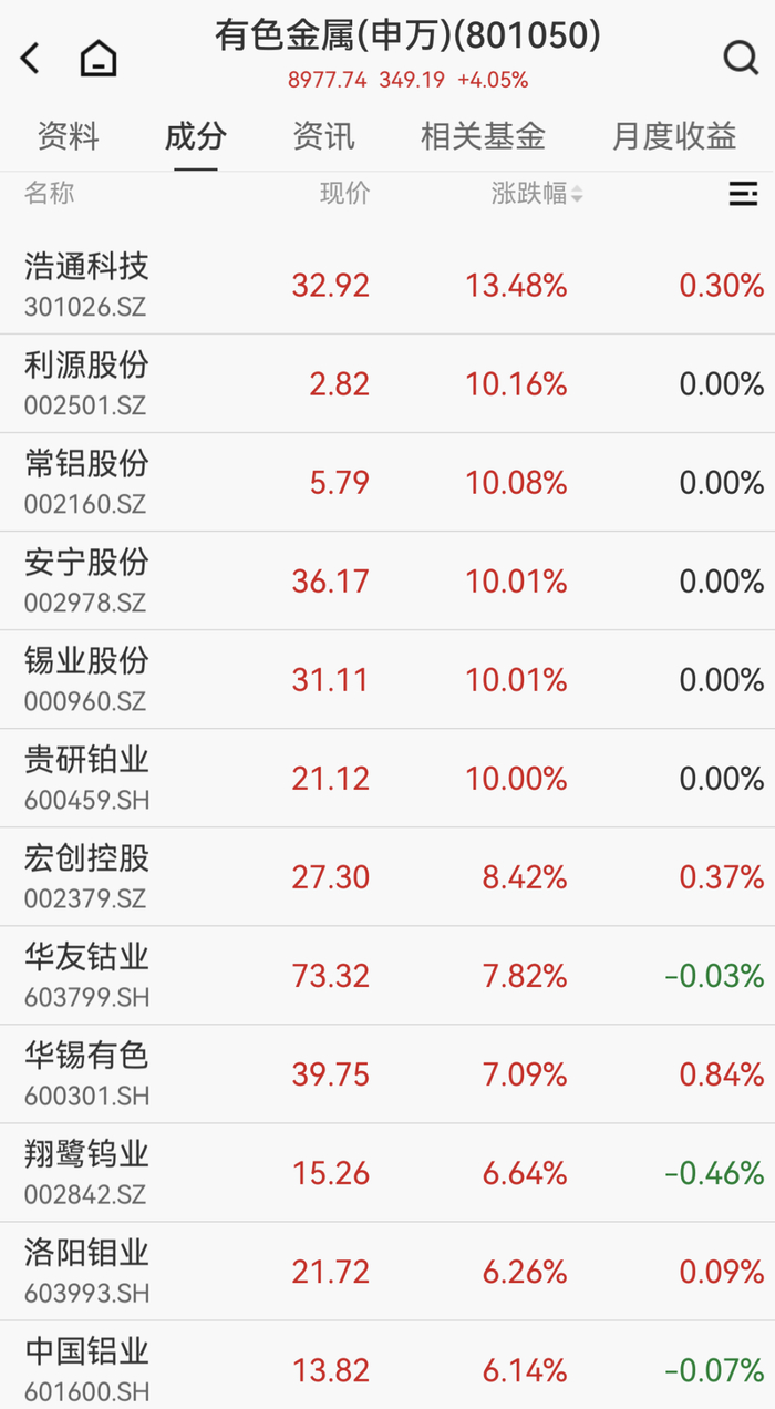今日(1月6日)早盘,A股有色金属板块再次大幅上涨,利源股份、常铝股份、安宁股份、锡业股份、贵研铂业等触及涨停板。