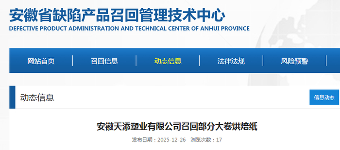 安徽天添塑业有限公司召回部分大卷烘焙纸