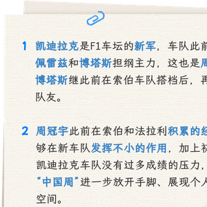凯迪拉克是F1车坛的新军,作为“菜鸟”,他们肯定会遇到不少困难,正是出于“平稳登陆”的考量,车队此前选择了2位拥有丰富F1赛车驾驶经验的车手——佩雷兹和博塔斯担纲主力,加上此番与同样有着F1比赛经历的周冠宇签约,这支新车队,拥有了一套经验和驾驶里程数都相当可观的阵容。这也是周冠宇与博塔斯继此前在索伯车队搭档后,再度成为队友。