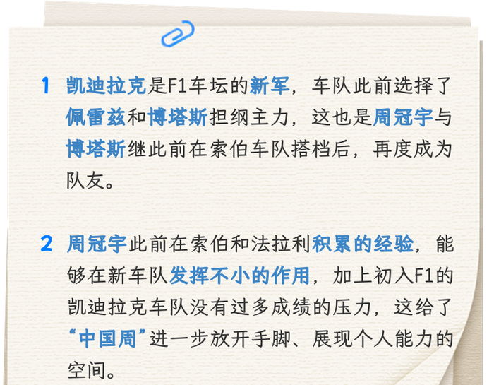 如今来到凯迪拉克车队,周冠宇所处的环境和之前有了许多不同。作为一支新军,车队的各项工作,都需要有经验的前辈提供建议,周冠宇此前在索伯和法拉利积累的经验,便能够发挥不小的作用,加上初入F1的凯迪拉克没有过多成绩的压力,这给了“中国周”进一步放开手脚,展现个人能力的空间。从这个角度看,加盟新车队的周冠宇,可能获得一片比在法拉利时宽广许多的舞台。