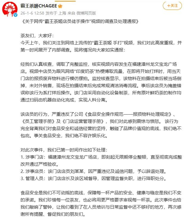 1月6日,@霸王茶姬 发布《关于网传“霸王茶姬店员徒手操作”视频的调查及处理通报》: