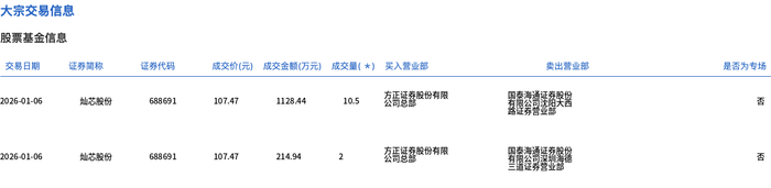1月6日,灿芯股份大宗交易成交12.5万股,成交额1343.38万元,占当日总成交额的1.55%,成交价107.47元,较市场收盘价109.11元折价1.5%。