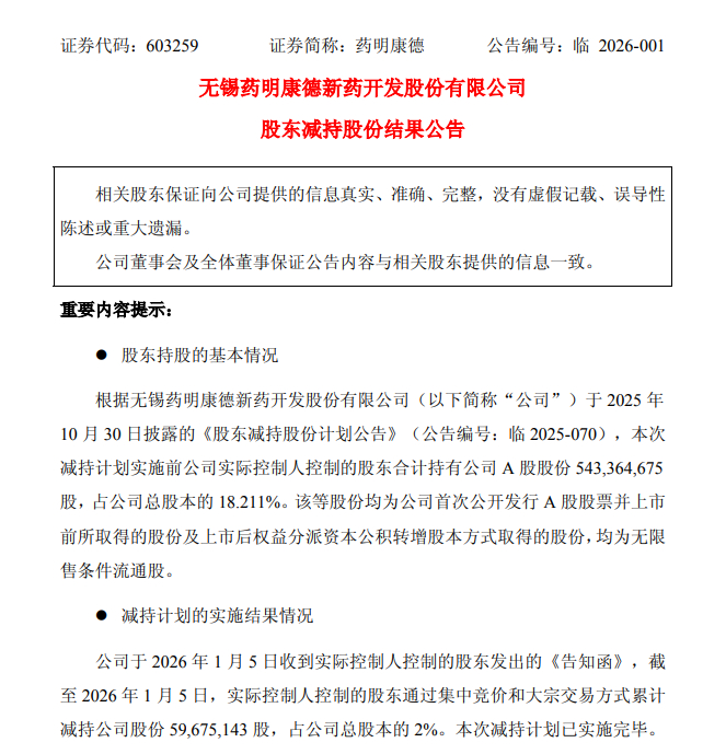 1月6日,药明康德(603259.SH)公告称,公司于2026年1月5日收到实际控制人控制的股东发出的《告知函》,截至2026 年1月5日,实际控制人控制的股东通过集中竞价和大宗交易方式累计减持公司股份5967.51万股,占公司总股本的2%。本次减持计划已实施完毕。