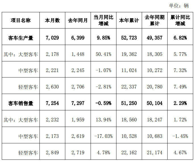 1月6日,金龙汽车(600686)发布公告,2025年12月份的客车产销数据快报显示,公司在该月生产客车7029辆,同比增长9.85%;销售客车7254辆,同比下降0.59%。