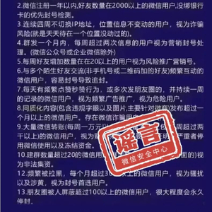为什么会出现这类谣言?记者了解到,这类说法实际上是黑灰产团伙为掩盖其违法活动而编造的借口。为了实施网络诈骗等犯罪行为,黑灰产团伙需要大量账号。他们通过非法手段获取账号后,往往会使用“外挂”批量添加好友、高频次群发欺诈信息、发布同质化违禁内容等,这些明显违反使用规范的行为,自然会触发平台的安全防护机制。