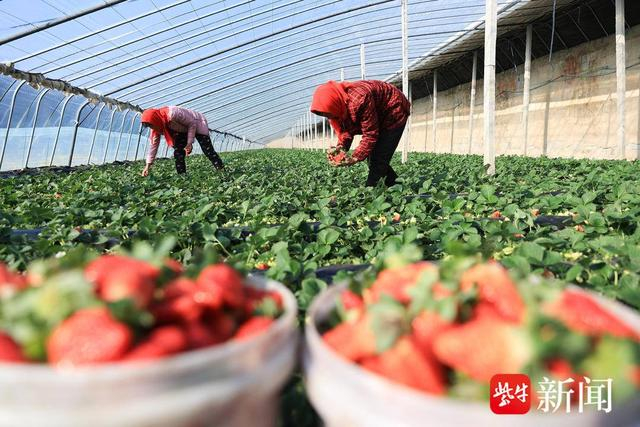 2026年1月5日,江苏省连云港市赣榆区金山镇赵湖村农民在大棚内采摘草莓。