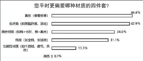 目前,市面上四件套的主流材质有棉、天丝(莱赛尔纤维)、真丝(桑蚕丝、柞蚕丝)、涤纶(聚酯纤维)以及其他材质。调查数据显示,消费者对四件套材质的偏好呈现多元分布,偏爱真丝(桑蚕丝)的占44.4%,化纤类(如聚酯纤维、涤纶)占42.9%;34.6%的受访者会选择混合材质(如棉+化纤、棉+真丝),31.1%的受访者喜爱纯棉(如全棉、长绒棉);另有13.3%的受访者青睐功能性材质(如牛奶绒、磨毛、天丝)。