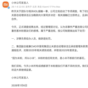 1月6日,小米公司发言人昨天关于团队与相关KOL接触一事,公司立刻启动了专项调查,有了初步结论,公关部总经理徐洁云当晚就向大家同步决定:相关接触已立即终止,且承诺未来不会合作。