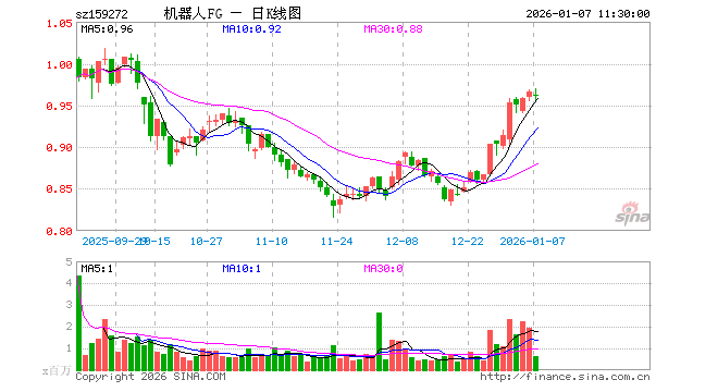 1月7日,截止午间收盘,机器人ETF富国(159272)跌0.52%,报0.961元,成交额6259.01万元。机器人ETF富国(159272)重仓股方面,双环传动截止午盘跌0.84%,机器人跌1.02%,绿的谐波跌3.52%,石头科技跌1.44%,埃斯顿涨0.17%,科沃斯跌1.85%,拓普集团跌1.64%,鸣志电器跌1.06%,拓斯达跌1.10%,兆威机电涨1.11%。