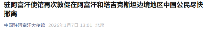 驻阿富汗使馆再次敦促在阿富汗和塔吉克斯坦边境地区中国公民尽快撤离