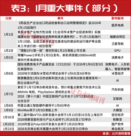此外,1月的重大事件还包括以下(包括但不限于),它们涉及AI、低空经济、国产软件、商业航天等多个主线(见表3)。