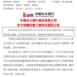 1月7日金融一线消息,光大银行今日发布公告称,公司董事会于2025年10月30日审议通过了《关于中国光大银行股份有限公司行使第三期优先股赎回权的议案》并形成决议,同意公司在取得国家金融监督管理总局(金融监管总局)等监管机构批准或认可的前提下,按照优先股募集说明书约定的赎回价格,赎回第三期优先股。近日,公司收到金融监管总局答复,对赎回第三期优先股无异议。为此,公司拟于2026年2月11日赎回第三期优先股。