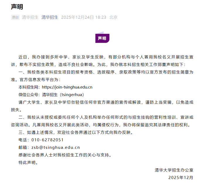 2025年12月24日,清华大学招生办发布郑重声明。强调清华大学各类本科招生项目的报考资格、选拔程序、录取政策等均以官方发布的招生简章为准,具体需关注清华招生微信公众号或本科招生网。清华大学从未授权或委托任何个人及机构举办任何形式的与招生挂钩的营利性培训、宣讲或咨询活动。