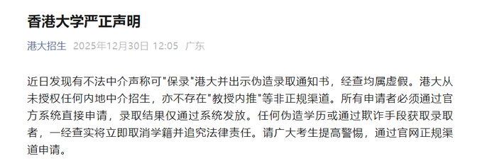 2025年12月30日,香港大学通过“港大招生”发布严正声明,近日发现有不法中介声称可“保录”港大并出示伪造录取通知书,经查均属虚假。港大从未授权任何内地中介招生,亦不存在“教授内推”等非正规渠道。所有申请者必须通过官方系统直接申请,录取结果仅通过系统发放。任何伪造学历或通过欺诈手段获取录取者,一经查实将立即取消学籍并追究法律责任。