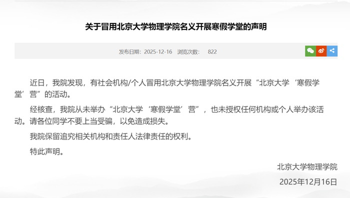 2025年12月16日,北京大学物理学院发布声明,有社会机构/个人冒用北京大学物理学院名义开展“北京大学‘寒假学堂’营”的活动。经核查,北京大学物理学院从未举办“北京大学‘寒假学堂’营”,也未授权任何机构或个人举办该活动。请各位同学不要上当受骗,以免造成损失。