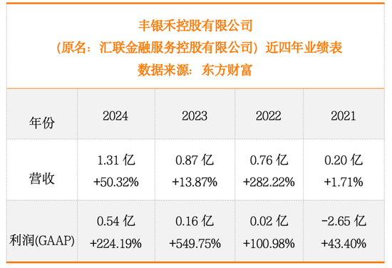 根据东方财富网的信息,2021年-2024年,丰银禾控股的净利润分别为-2.65亿元、0.02亿元、0.16亿元和0.54亿元,增速分别高达43.40%、100.98%、549.75%和224.19%。