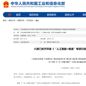 【导读】工业和信息化部等八部门印发《“人工智能+制造”专项行动实施意见》
