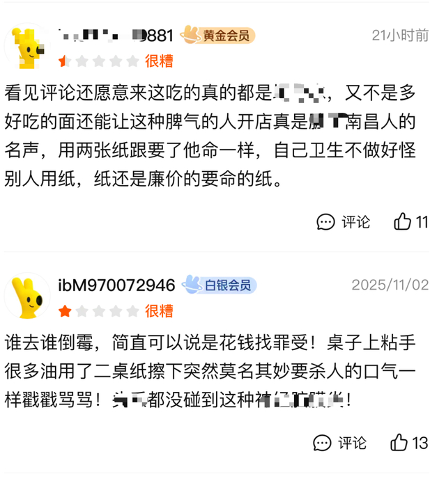 1月6日,有网友发帖称,在江西南昌一面馆就餐时,因使用两张抽纸而遭老板驱赶和言语辱骂。