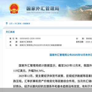 对于当月外汇储备规模变动的原因,国家外汇管理局指出,2025年12月,受主要经济体货币政策、宏观经济数据等因素影响,美元指数下跌,全球金融资产价格涨跌互现。汇率折算和资产价格变化等因素综合作用,当月外汇储备规模上升。