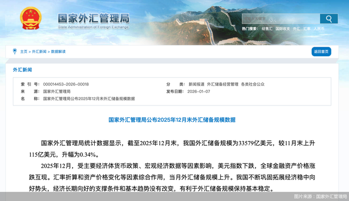 1月7日,国家外汇管理局发布的统计数据显示,截至2025年12月末,我国外汇储备规模为33579亿美元,较11月末上升115亿美元,升幅为0.34%。