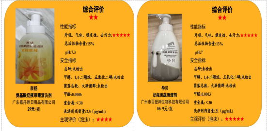 测试结果显示,20款奶瓶清洁剂样品的“外观、气味、稳定性、去污力”等4个项目检测结果均符合推荐性国家标准GB/T 9985-2022《手洗餐具用洗涤剂》的要求。其中,2款样品表现优秀获五星,5款样品表现较好获四星,6款样品表现良好获三星,6款样品表现一般获二星,1款样品“真如甘露”不符合国家标准,不予评星。测试结果仅对此次比较试验购买的样品负责。