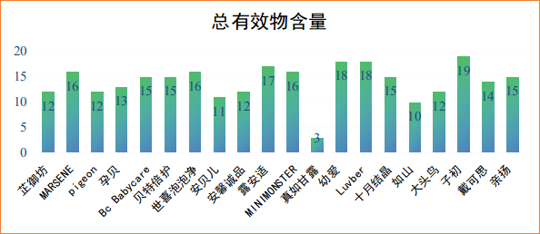 总有效物含量是洗涤剂中起主要去污作用的表面活性剂成分总和,其含量直接影响去污效果。GB/T 9985-2022《手洗餐具用洗涤剂》要求总有效物含量≥15%,GB/T 24691-2022《果蔬清洗剂》要求总有效物含量≥10%。测试结果显示,20款奶瓶清洁剂样品中,19款样品的总有效物含量均高于样品所明示的标准;1款样品“真如甘露”的总有效物含量为3%,不符合有关国家标准的要求,低于样品所明示的标准。
