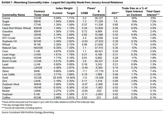 法国兴业银行大宗商品分析师在周三早些时候发布的一份报告中表示,年度指数重新平衡对白银和黄金价格构成重大风险,因为它们是2025年表现最佳的两种资产。商品分析师指出,黄金和白银约占BCOM的11%。“去年年底白银的强劲上涨使其处于预期净抛售的最前沿。”
