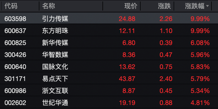 传媒板块涨幅居前,板块涨幅超过2%,引力传媒、东方明珠涨停,新华传媒、易点天下、华智数媒、浙文互联、国脉文化等多股跟涨。