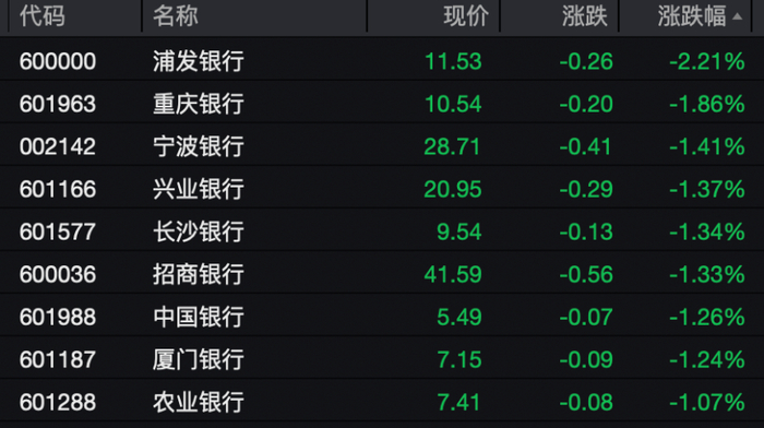 银行板块上午也跌幅居前,浦发银行、重庆银行、兴业银行、长沙银行等近10只银行股跌幅超过1%。