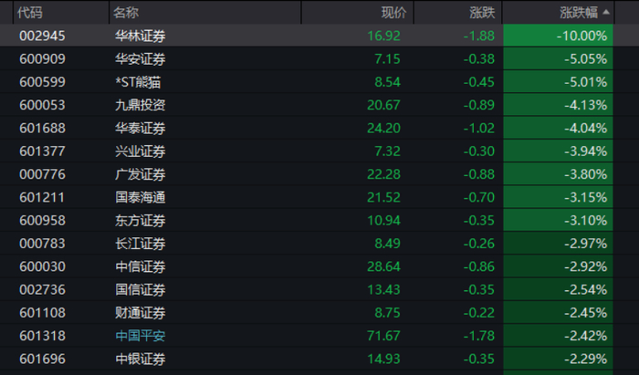 非银金融板块上午领跌,板块跌幅超过2%,其中多只券商股跌幅居前。华林证券跌停,华安证券、兴业证券、广发证券、华泰证券、国泰海通、东方证券等多股跌幅超过3%。