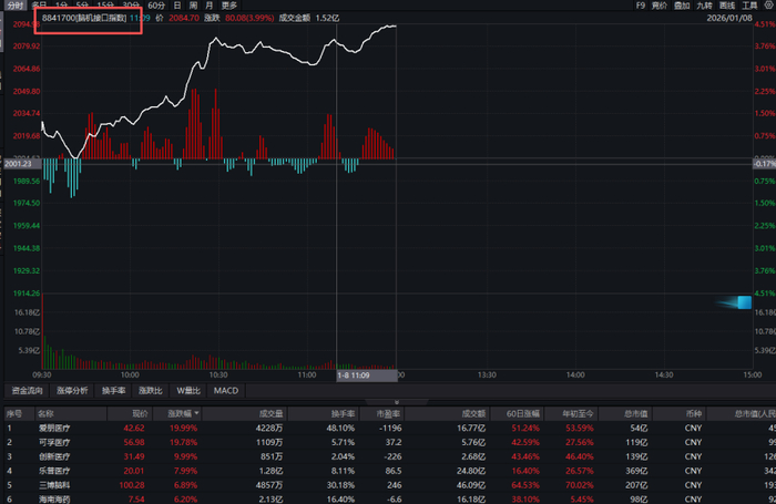 概念板块方面,今天上午脑机接口概念重新活跃,相关概念指数涨幅超过4%。