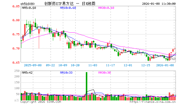1月8日,截止午间收盘,创新药ETF易方达(516080)涨0.29%,报0.698元,成交额2263.35万元。创新药ETF易方达(516080)重仓股方面,药明康德截止午盘涨0.02%,恒瑞医药跌0.38%,长春高新涨1.92%,科伦药业涨6.38%,复星医药涨0.73%,华东医药涨0.00%,百济神州涨0.63%,信立泰涨3.93%,康龙化成涨0.90%,泰格医药涨1.04%。
