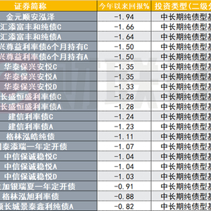 具体来看,部分中长期纯债基2026年一周的时间净值已下跌超过1个点。金元顺安泓泽、汇添富丰和纯债A/C、华泰保兴尊益利率债6个月持有A/C、华泰保兴安悦A/C/D、长盛恒盛利率债A/C等产品跌幅居前。