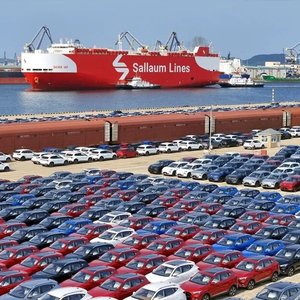 国产汽车在山东港口烟台港集结等待装船出口(2025年9月14日摄,无人机照片)。新华社发(唐克 摄)